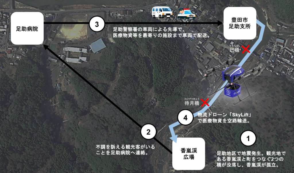 想定シナリオ | 地震が発生。香嵐渓を囲う巴川に架かる橋が地震の影響で使用不可の状況に。香嵐渓において取り残され、不調を訴える観光客が発生するも、陸路では必要な物資を届けることができない。足助病院から届いた医療物資等を、物流ドローン『SkyLift』を活用して、豊田市足助支所から香嵐渓広場へ空路で運搬する。 |