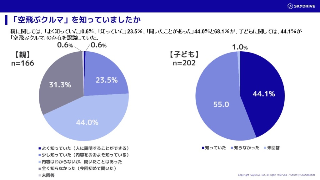 ・大人は約70%、子どもは約45%が、空飛ぶクルマの存在を認識。