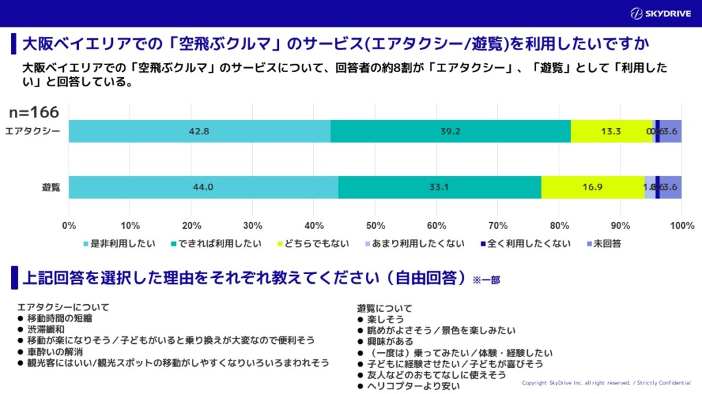 ・大阪ベイエリアでの空飛ぶクルマのサービス利用について、エアタクシー、遊覧共に約80%が利用を希望。