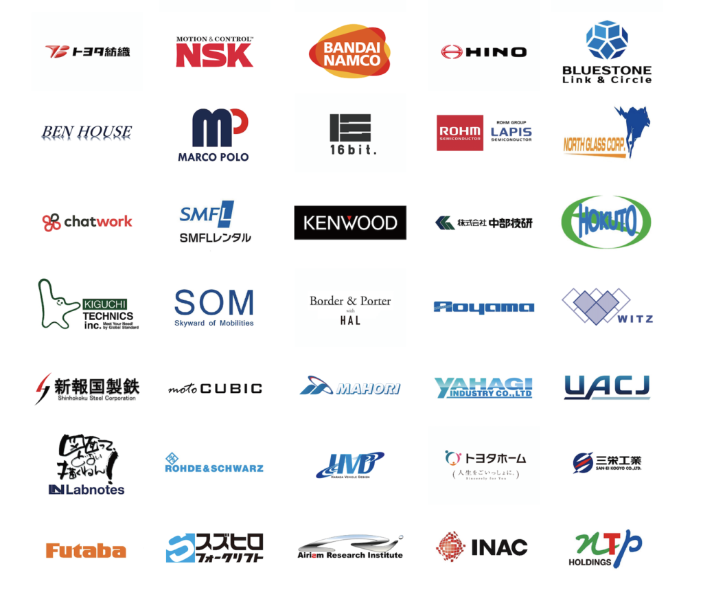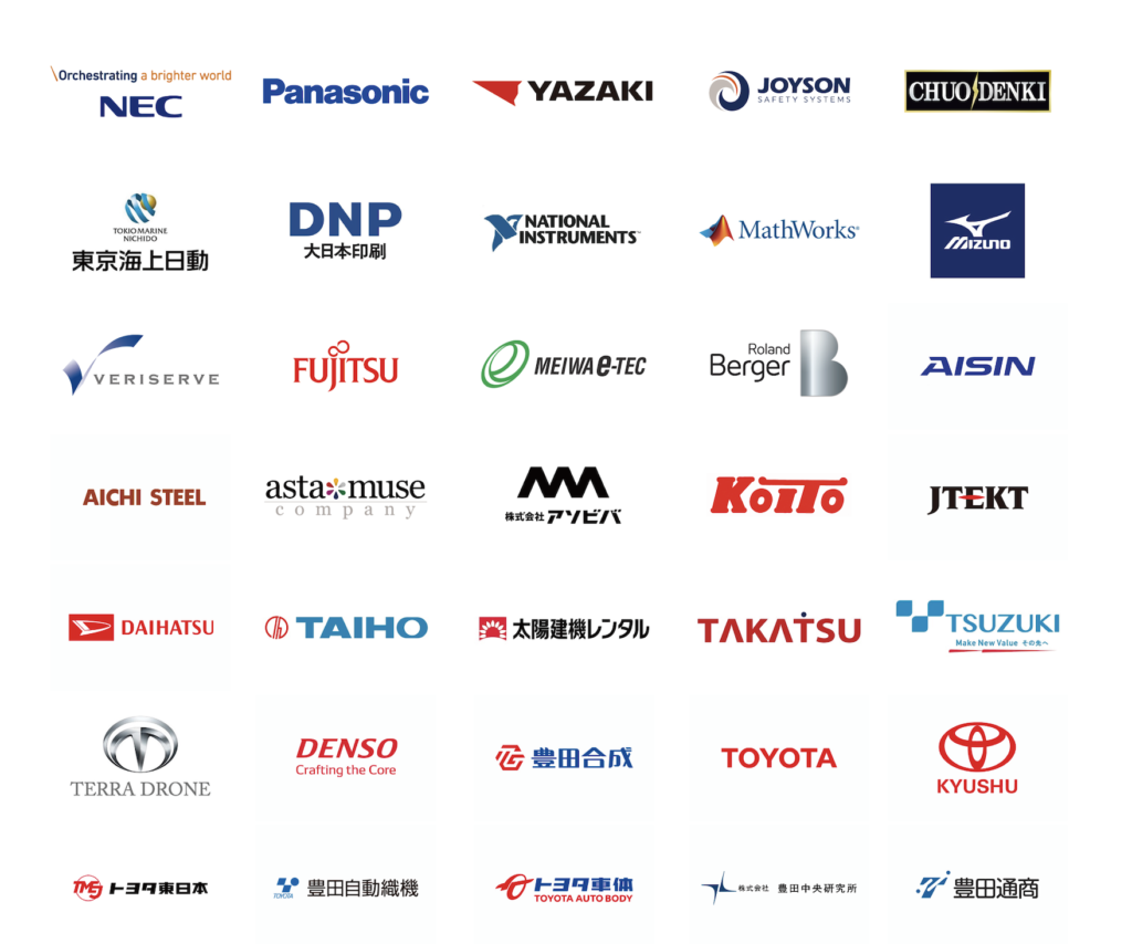 日本電気株式会社(NEC)、パナソニック株式会社、矢崎総業株式会社、ジョイソン・セイフティ・システムズ・ジャパン株式会社、中央電気工事株式会社、東京海上日動火災保険株式会社、大日本印刷株式会社、日本ナショナルインスツルメンツ株式会社、MathWorks Japan、ミズノ株式会社、株式会社ベリサーブ、富士通株式会社、株式会社明和eテック、株式会社ローランド・ベルガー、アイシン精機株式会社、愛知製鋼株式会社、アスタミューゼ株式会社、株式会社アソビバ、株式会社小糸製作所、株式会社ジェイテクト、ダイハツ工業株式会社、大豊工業株式会社、太陽建機レンタル株式会社、株式会社高津製作所、都築電気株式会社、テラドローン株式会社、株式会社デンソー、豊田合成株式会社、トヨタ自動車株式会社、トヨタ自動車九州株式会社、トヨタ自動車東日本株式会社、株式会社豊田自動織機、トヨタ車体株式会社、株式会社豊田中央研究所、豊田通商株式会社、トヨタ紡織株式会社、日本精工株式会社、日本郵政キャピタル株式会社、株式会社バンダイナムコホールディングス、日野自動車株式会社、株式会社ブルーストーンリンクアンドサークル、株式会社ベンハウス、株式会社マルコオ・ポーロ化工、株式会社16bit.、ローム株式会社、ノースガラス株式会社、ChatWork株式会社、SMFLレンタル株式会社、株式会社JVCケンウッド、株式会社中部技研、株式会社北東電機、株式会社キグチテクニクス、株式会社スカイワード・オブ・モビリティーズ、株式会社ボーダー・アンド・ポーター、株式会社青山製作所、株式会社ヴィッツ、新報国製鉄株式会社、株式会社東亜製作所、株式会社マホリ、矢作産業株式会社、株式会社UACJ、株式会社ラブノーツ、ローデ・シュワルツ・ジャパン株式会社、原田車両設計株式会社、トヨタホーム株式会社、三栄工業株式会社、双葉電子工業株式会社、スズヒロフォークリフト株式会社、ARI、株式会社イナック、NTPホールディングス株式会社、クーネン&ヴァッカー特許法律事務所、小西模型株式会社 (JR/DFA)、株式会社ジュピターコーポレーション、株式会社ショウホウテック、新電元工業株式会社、有限会社D-WEBER、ディーエスエムジャパン エンジニアリング プラスチックス株式会社、Desert Aircraft、株式会社トヨコー、浜静トレーディング株式会社、株式会社ハーベス、HILLTOP株式会社、株式会社フジタ、マゼランシステムズジャパン株式会社、ARROW MARK、FUTURE HOUSE lab.、freee株式会社、ミヤ電子株式会社、株式会社コウメイ、渥美坂井法律事務所・外国法共同事業、ソニーピーシーエル株式会社、株式会社goen、株式会社ナカハタ(一部、先方の都合で掲載なしの企業あり)