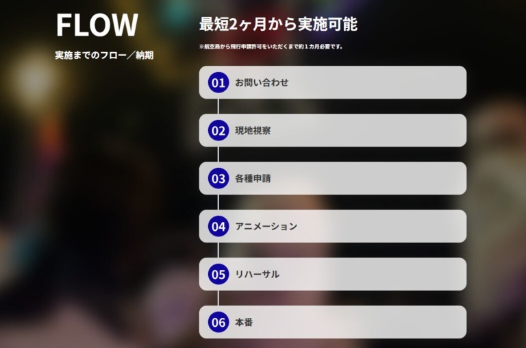 SkyDriveが開催するドローンショーは、すべての手続きをSkyDriveが行うため、細かい手続き方法や内容が分からない、という方でも安心して依頼することができます。