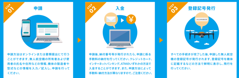 機体登録は、申請→入金→登録番号発行の流れで行います。書類申請だけでなく、オンラインでも申請可能なため簡単です。機体の種類、製造番号、重量などの情報と、使用する法人の情報は忘れずに準備しましょう。