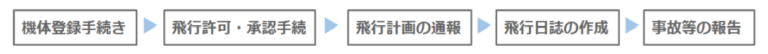 ・ドローンの「機体登録」の手続き ・ドローンを飛ばす場所に対しての「飛行許可」申請 ・ドローンを飛ばす方法に対しての「飛行承認」申請