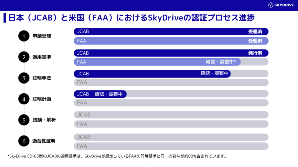 当社の機体に特化した審査基準の詳細がおおむね合意に至ったことから、適用基準が発行されました。この審査基準に基づき、すでに航空局と議論を開始した試験の実施時期や内容について合意し、証明計画を策定していきます。その計画に沿って、地上試験や飛行試験を実施してまいります。なお、当社は日本の航空局とアメリカ連邦航空局(Federal Aviation Administration、以下「FAA」)に対する型式証明活動に同時に取り組んでおり、日本での型式証明取得後、米国でも速やかに型式証明を取得できるよう進めてまいります。