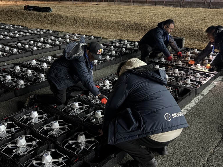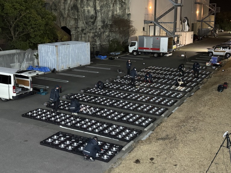 SkyDrive野村:我々が所有している機体は、1ケースに12機体のドローンが入っていて、ケースから出さなくても箱の中からそのまま飛び立つことができます。そのため、ドローンショーの離着陸エリアは従来に比べて約1/3程度のスペースで済みます。園内の限られたスペースで500機体の規模のドローンショーを実施できたことは、弊社の強みです。