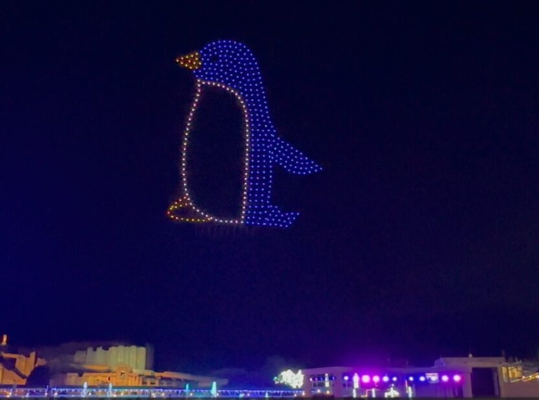 特にお客さまから「お~~~!」と歓声があがったのは、ペンギンと”ラグーナテンボス”の文字の演出です。500機でペンギンを演出したので、密度も濃く迫力のあるものになりました。
