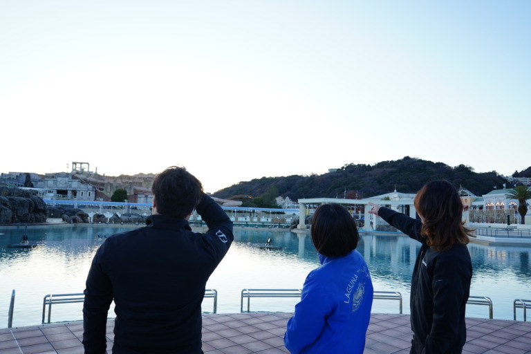 SkyDrive野村:まずは、お客さまに最高のドローンショーを楽しんでいただくために、どこで飛行させるのがベストかを検討し、海辺と園内の下見を行いました。海辺は広いスペースがあり、より大きなショーができるのですが、ラグナシア園内のお客さまから見ていただくには距離がありました。そのため、飛行エリアは小さくなりますが園内でショーを行う方が、お客さまにより迫力のあるドローンショーを提供できると判断しました。