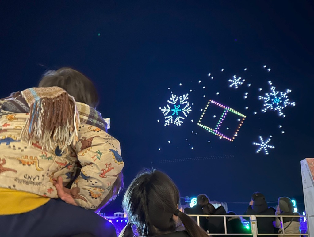 SkyDrive横越:イルミネーションとドローンショーが視野全体に広がった光の光景を楽しんでいただけたのではと思います。動画だと伝わりづらいですが、現地ではドローンが目の前に迫ってくるような迫力感を出すことができました。