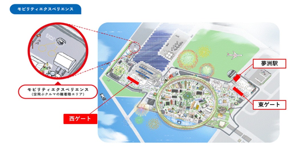 デモフライトは、万博会場内北西部の「モビリティエクスペリエンス」に位置する「EXPO Vertiport」を離着陸地点として周回飛行を行う予定です。なお、EXPO Vertiportは、西ゲートからのアクセスが便利です。