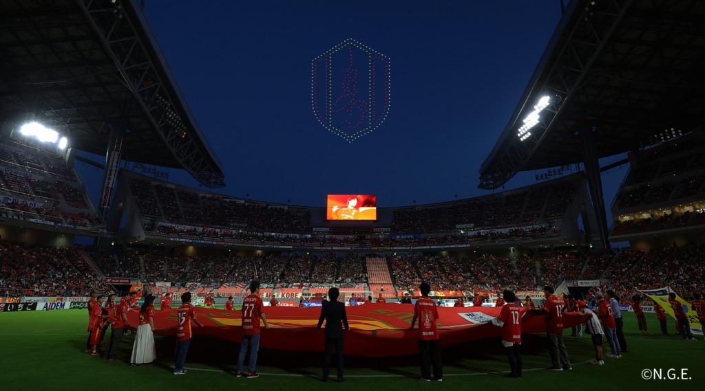 300機のドローンが豊田スタジアム内の大型スクリーンに映る選手紹介映像と連動し、名古屋グランパスのロゴやエンブレム、「鯱の大祭典」を象徴する金鯱グランパスくんなどを描きます。