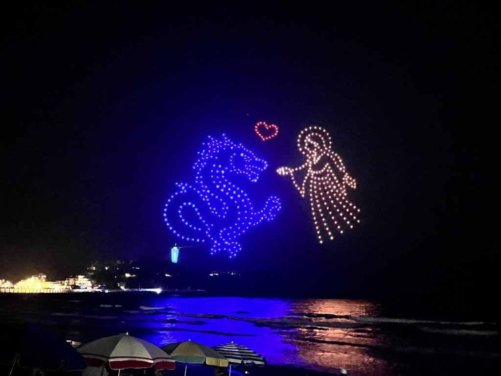 本ドローンショーは、毎年100万人を超える来場者が訪れる片瀬西浜・鵠沼海水浴場で開催された「江の島マイアミビーチショー“夏”花火」のオープニングイベントとして実施されました。今年は、江の島海水浴場協同組合と連携し江の島に伝わる神話「天女と五頭龍」をテーマにしたストーリー構成を初めて導入。ドローンショーという最先端の演出手法で、地域の歴史や物語を来場者に自然と親しみながら理解を深めてもらえる、新しい形でのエンターテインメントの創出と文化的発信を目指した構成となっています。