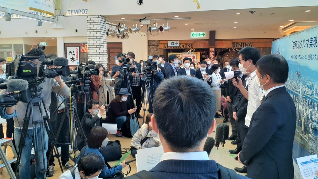 ②天保山マーケットプレースにて、空飛ぶクルマのSD-03展示モデル機、空飛ぶクルマ周辺技術(ポート建設、充電・エネルギー関連等)のパネル展示