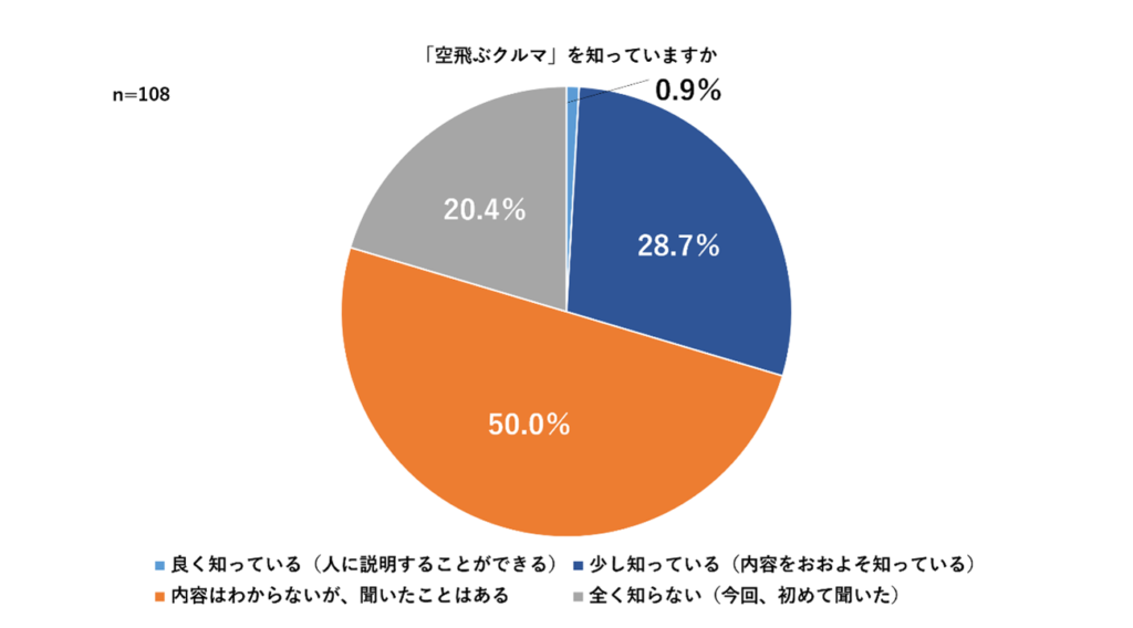 「全く知らない」が20.4%、「聞いたことがある」が50%、「知っている」が29.6%と、約80%の人が詳細は知らないが「空飛ぶクルマ」の存在を認識していた。