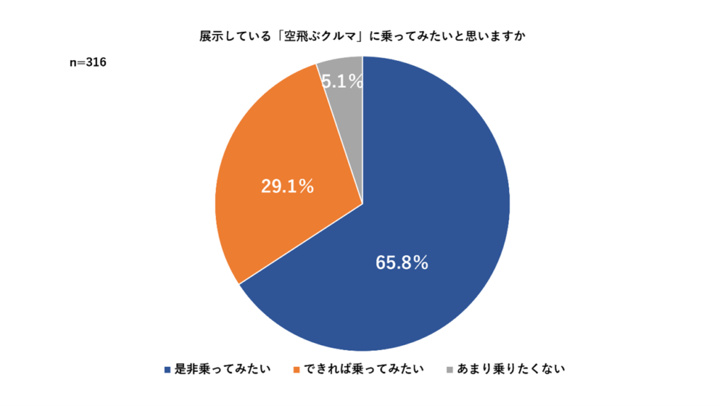 「全く乗ってみたくない」は0%、「是非乗ってみたい」が65.8%、「できれば乗ってみたい」が29.1%、「あまり乗りたくない」が5.1%と、94%以上の人が「空飛ぶクルマ」に乗ることに興味を示した。