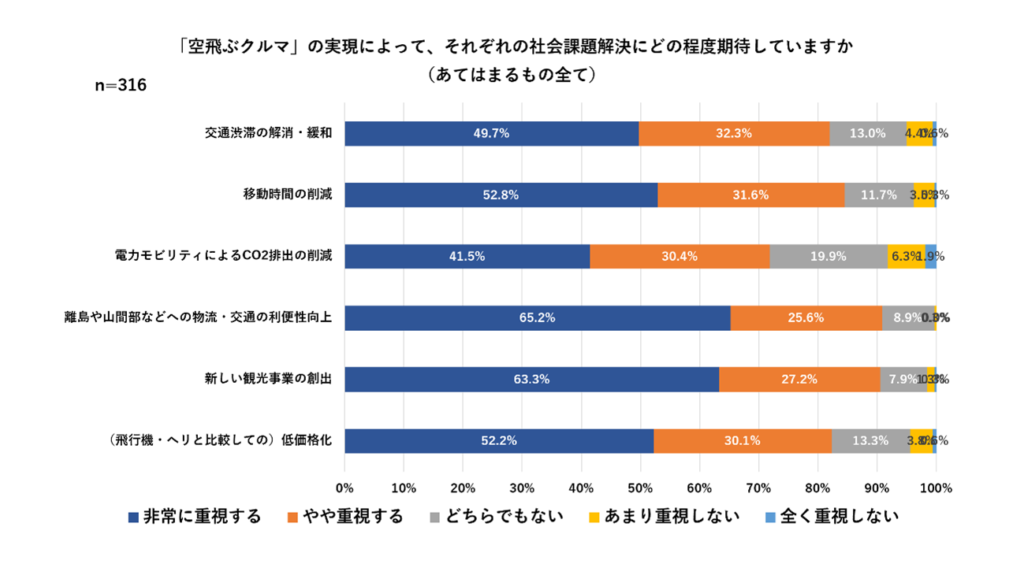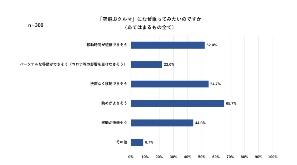 「眺めがよさそう」65.7%と、空ならではの体験への期待が一番多く、次いで「渋滞のない生活」54.7%や「移動時間の短縮」52%といった移動の利便性向上への期待が大きかった。またフリーコメントでは、「好きな時に移動できる」「離島へのアクセスが便利になる」といった日常生活を便利にするモビリティとしての期待も大きかった。