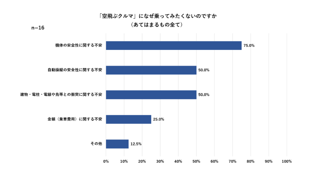 「空飛ぶクルマ」に乗ってみたくない人は全体の約5%で、「機体」「自動操縦」「衝突」といった安全性全般に対する不安が大きかった。