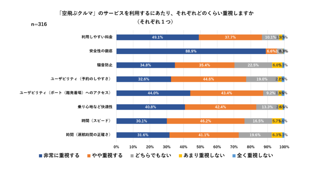 Q5「空飛ぶクルマ」のサービスを利用するにあたり、それぞれどのくらい重視しますか
