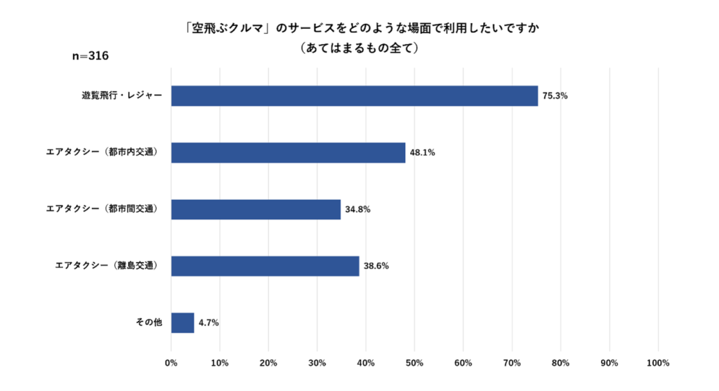 「遊覧飛行・レジャー」が飛びぬけて75.3%と非日常生活への期待が大きかったが、フリーコメントでは「救急医療」「山間部の生活補助」「自家用」「物流」といったコメントも多数あり、日常生活を便利にするモビリティとしてイメージする人もいた。