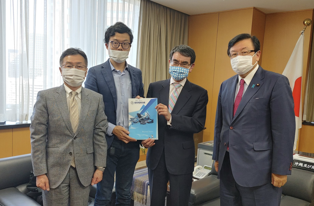 空飛ぶクルマの開発に必要な環境整備について、議論させていただきました。※写真は左から SkyDrive CTO岸、代表取締役CEO福澤、河野大臣、長坂経済産業副大臣兼内閣府副大臣